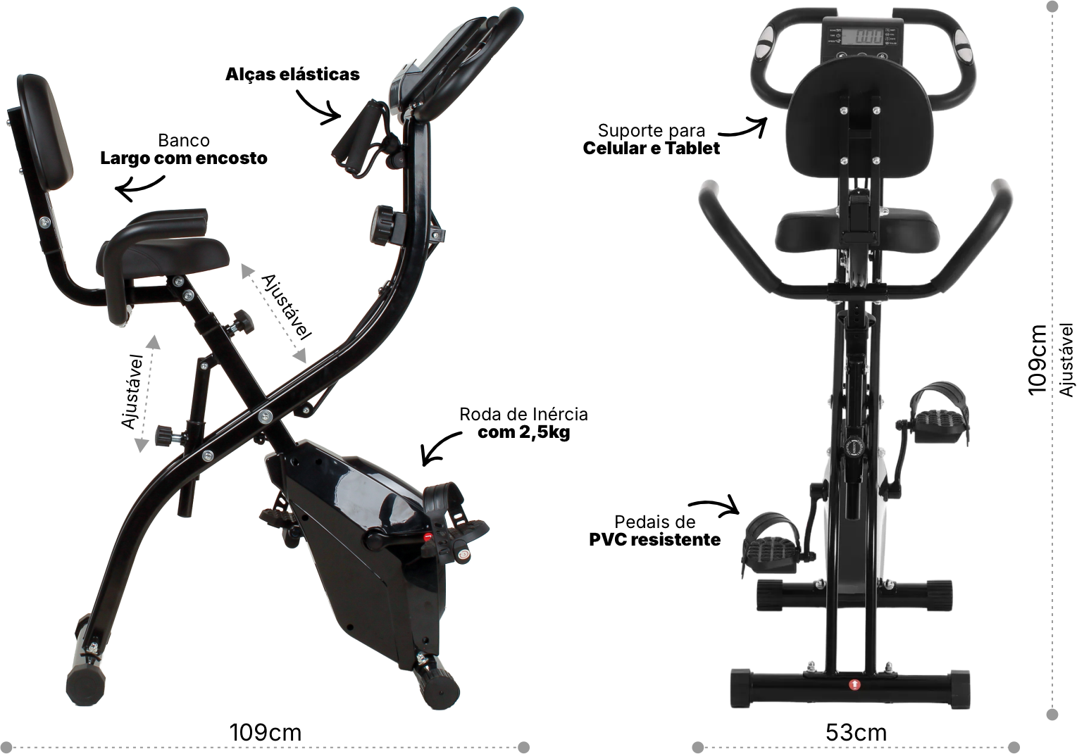 ✔ Assento e guidão ajustáveis: conforto total para diferentes alturas e biotipos.